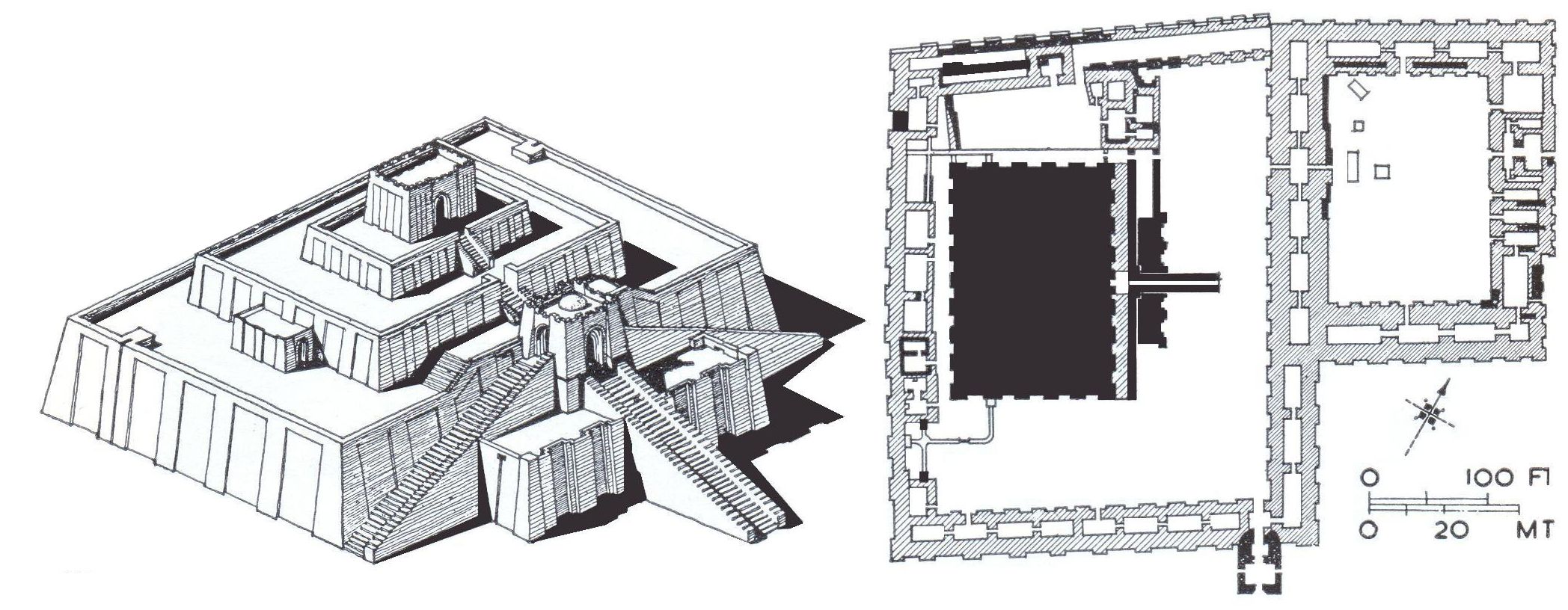 (left) reconstructed drawing of Ziggurat at Ur, and (right) temple complex plan with ziggurat surrounded by walls, from A History of Architecture on the Comparative Method (1898) by Banister Fletcher, under public domain