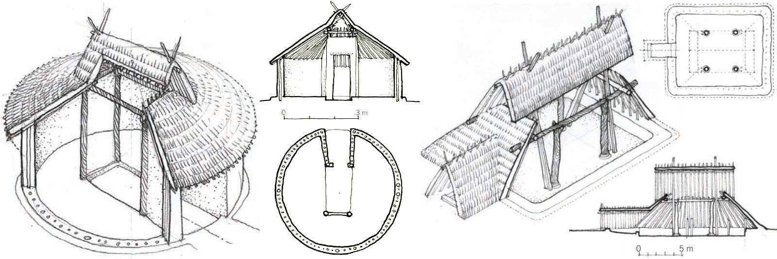 (left) reconstructions of a mud-wood circular dwelling with firepit in center, (right) larger meeting hall from Banpo, China circa 4500 BCE; from A Global History of Architecture, 2nd edition