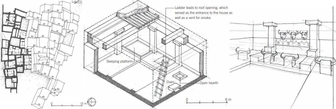 (left) diagram of a housing pattern, (center) typical house made of mud brick + oak beams, and (right) typical household family shrine with bull horns set in clay; from Çatalhöyük, Turkey circa 3000 BCE; from A Global History of Architecture, 2nd edition